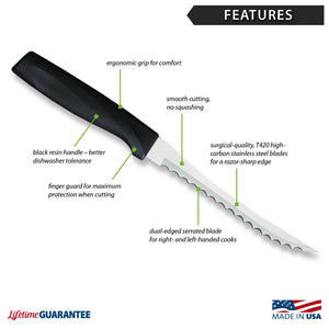 To assure our customers get the best knives available, all Rada blades are crafted from surgical-quality, T420 high-carbon stainless steel for a lifetime of durability then hollow ground for incredible sharpness. The super-sharp, dual serrated blade of the Tomato Slicer allows right- and left-handed users to achieve great results.