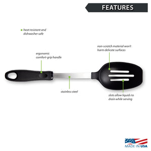 Rada’s Slotted Spoon is heat resistant, dishwasher safe, and non-scratch so it won’t harm the delicate the surfaces of your favorite saucepans and skillets. With tons of uses, it’s the perfect utensil for your kitchen.