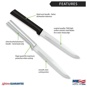 To assure our customers get the best knives available, all Rada blades are crafted from surgical-quality, T420 high-carbon stainless steel for a lifetime of durability then hollow ground for incredible sharpness. When needed, non-serrated blades can be easily resharpened using Rada’s Quick Edge Knife Sharpener.