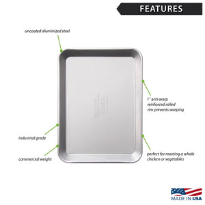 This pan is the perfect size for baking chicken or roasting veggies for two. The 1ʺ sides allow foods to bake quickly and evenly, wonderful for easily browning bread crumbs and toasting nuts and coconut. Ideal for a small batch of cookies, garlic bread, or French fries.