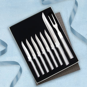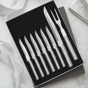 The Meat Lover’s Gift Set includes six Serrated Steak Knives, a non-serrated Slicer, and a Carving Fork - everything you need for a delicious feast!