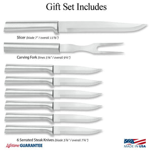 INCLUDES Six Serrated Steak Knives, Slicer, Carving Fork